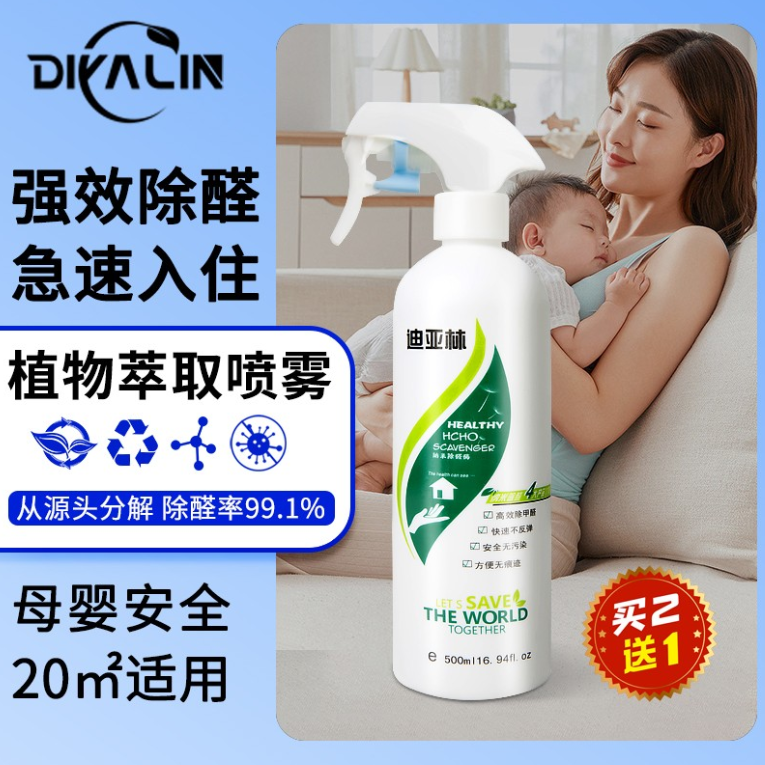迪亚林是植物提取液的成分,不需要光线参与可以直接分解污染源,从源头去除甲醛,母婴级别,安全有保障!除醛率高达99.1%,业内口碑非常不错的一款除甲醛喷雾,经过线下15年实践验证的一款成熟稳定的除甲醛产品。产品不留痕迹,家里的家具板材,沙发床垫,布艺皮革,墙面均可以喷洒使用,不留痕迹,没有二次污染。
