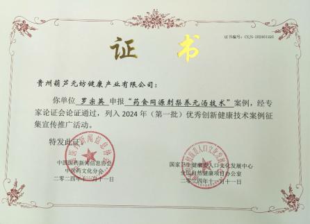 “药食同源刺梨养元汤技术 ”入选国家卫健委人口文化发展中心 2024年第一批“优秀创新健康技术案例征集宣传推广 ”活动证书