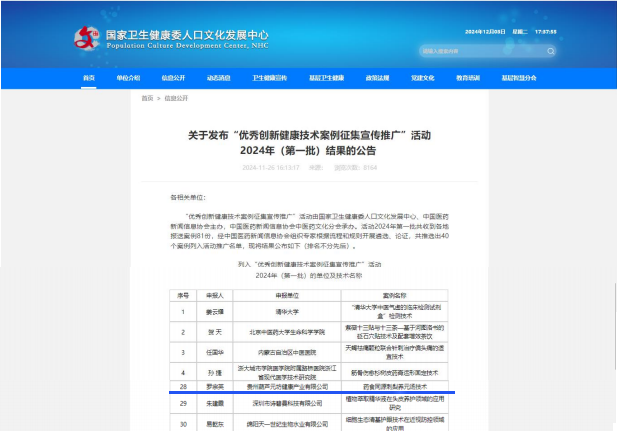 日前 , 国家卫健委人口文化发展中心发布“优秀创新健康 技术案例征集宣传推广 ”活动2024年(第一批)的结果 ,根据国 家卫健委人口文化发展中心发布官网公示 ,本次工作2024年 第一批共收到各地报送案例81份 ,经主办方组织专家根据流程 和规则开展遴选 、论证 ,共推选出40个案例列入活动推广名 单 ,贵州葫芦元坊健康产业有限公司董事长罗宗英申报的“药食同源刺梨养元汤技术 ”经专家论证会论证通过 ,列入2024 年(第一批)“优秀创新健康技术案例征集宣传推广 ”活动。