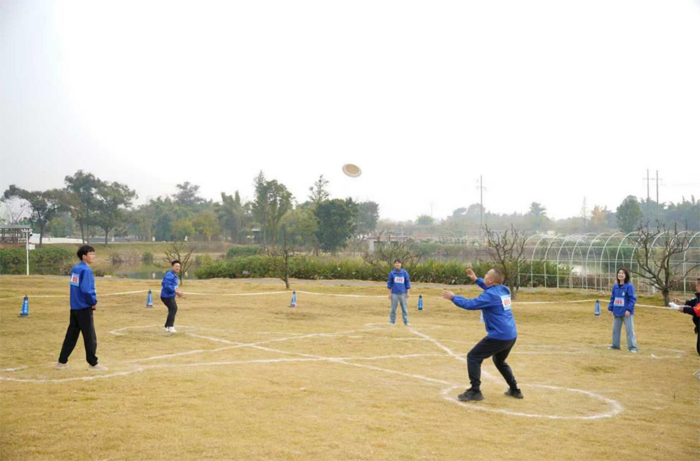 飞盘团体接力赛:参赛团队站成五角星,飞盘在空中划出优美的弧线,每一次传递不仅考验发盘的精准,更要求接盘的默契。