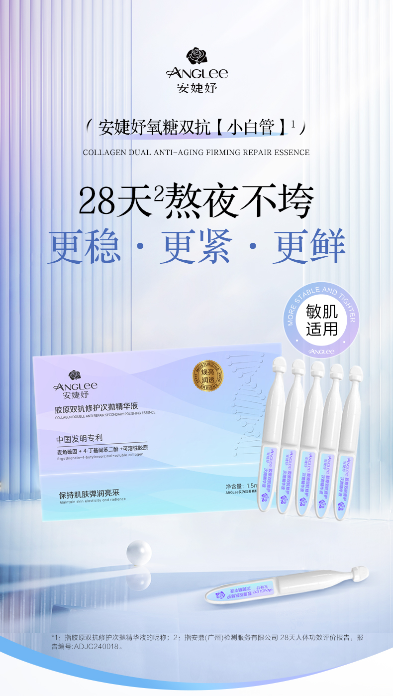 安婕妤氧糖双抗小白管以科学严谨的成分和技术,为肌肤提供温和而高效的修护方案。其中,明星成分麦角硫因有着“抗氧爱马仕”之称,能够温和中和自由基,减少外界环境对肌肤屏障的损伤。同时,它还可以激发肌肤自我修护机制,从根本上增强屏障功能,让肌肤在应对外界刺激时更加稳定和强韧。针对敏感肌容易出现的暗沉问题,特别添加的4-丁基间苯二酚成分可精准抑制黑色素生成,显著提亮肤色,改善因炎症导致的肤色不均现象。源于双专利可溶性胶原与水解胶原的协同修护作用,这些成分经过人体同源技术优化,能够为敏感肌补充所需营养,加速细胞修复与屏障再生。独特的次抛设计保持了每次使用的新鲜与高效,更贴合敏感肌对安全性和洁净度的高要求。