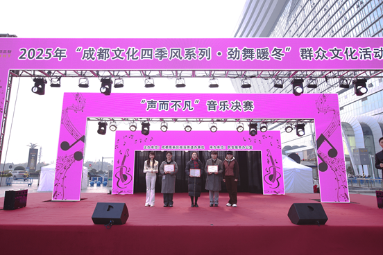 2025年12月16日,“成都文化四季风・劲舞暖冬”系列群众文化活动重头戏 ——“声而不凡”音乐比赛,在成都环球中心东广场热烈收官。赛事以青春为墨、以音乐为笺,汇聚桂溪街道一众青年音乐爱好者登台竞技,用嘹亮歌声传递热爱、用鲜活演绎点亮冬日,为辖区市民献上了一场兼具专业质感与情感温度的文化盛宴。