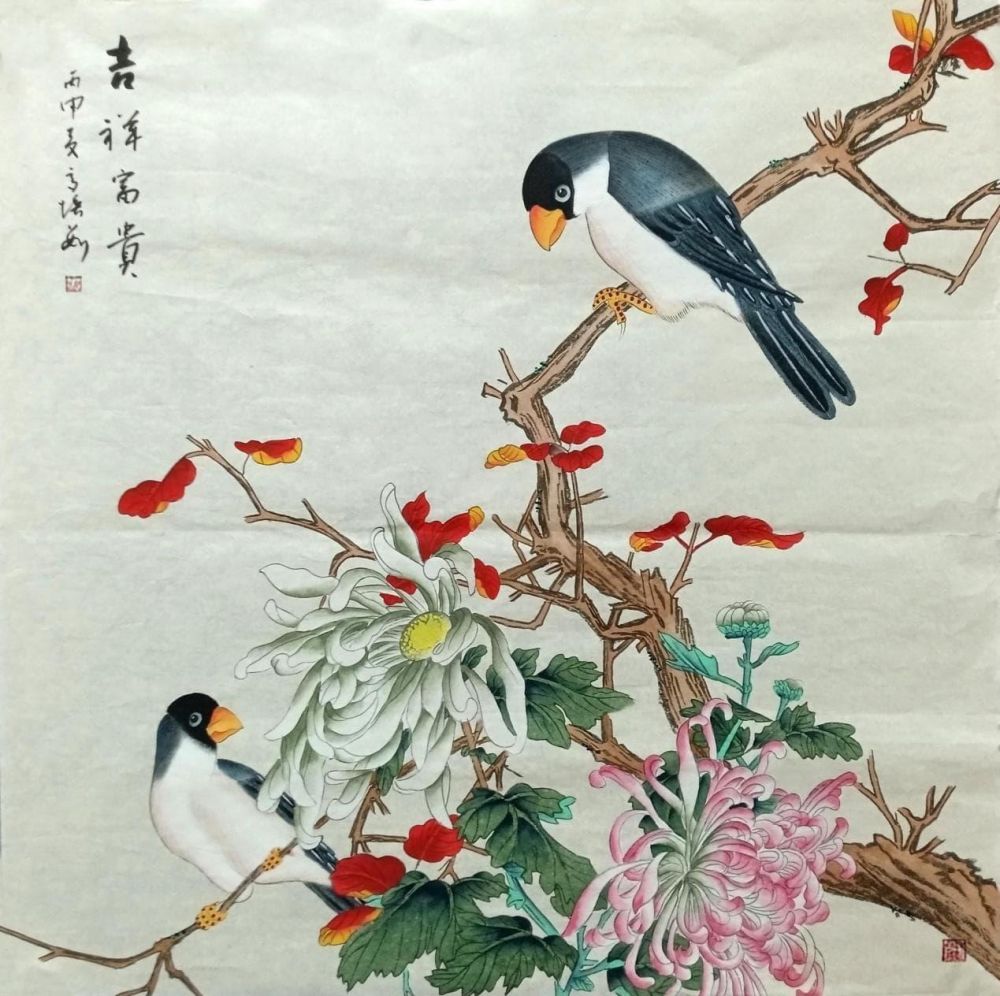 擅长花鸟及山水,作品特点并加以创新,发扬了国画的优良传统,在绘画技术上,一反勾勒法而用“没骨法”,用“撞水撞粉”法, 以求其真。作品以传统笔墨技法为主,在形态、色彩、构图、笔 调上的表现清新可喜,雅俗共赏,极具收藏价值。