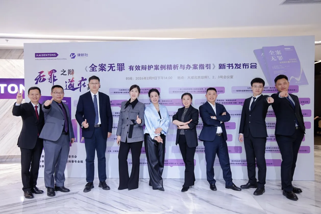 2026年2月9日下午,大成刑事专业委员会组编的《全案无罪:有效辩护案例精析与办案指引》新书发布会在大成北京总所隆重举行。本次发布会由大成刑事专业委员会主办,大成北京总所刑事专业组协办,律新社提供支持,汇聚业内资深法律人士,共探无罪辩护之道,共话法治建设新征程。