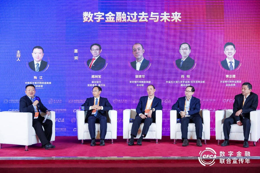 圆桌一:《数字金融过去与未来》,左起:中国民生银行网络金融部副总经理陶江,廊坊银行党委委员、副行长陈树军,浦发银行网络金融部总经理薛建华,中国光大银行数字金融/云生活事业部副总经理药明,兴业银行数字运营部副总经理黄正建
