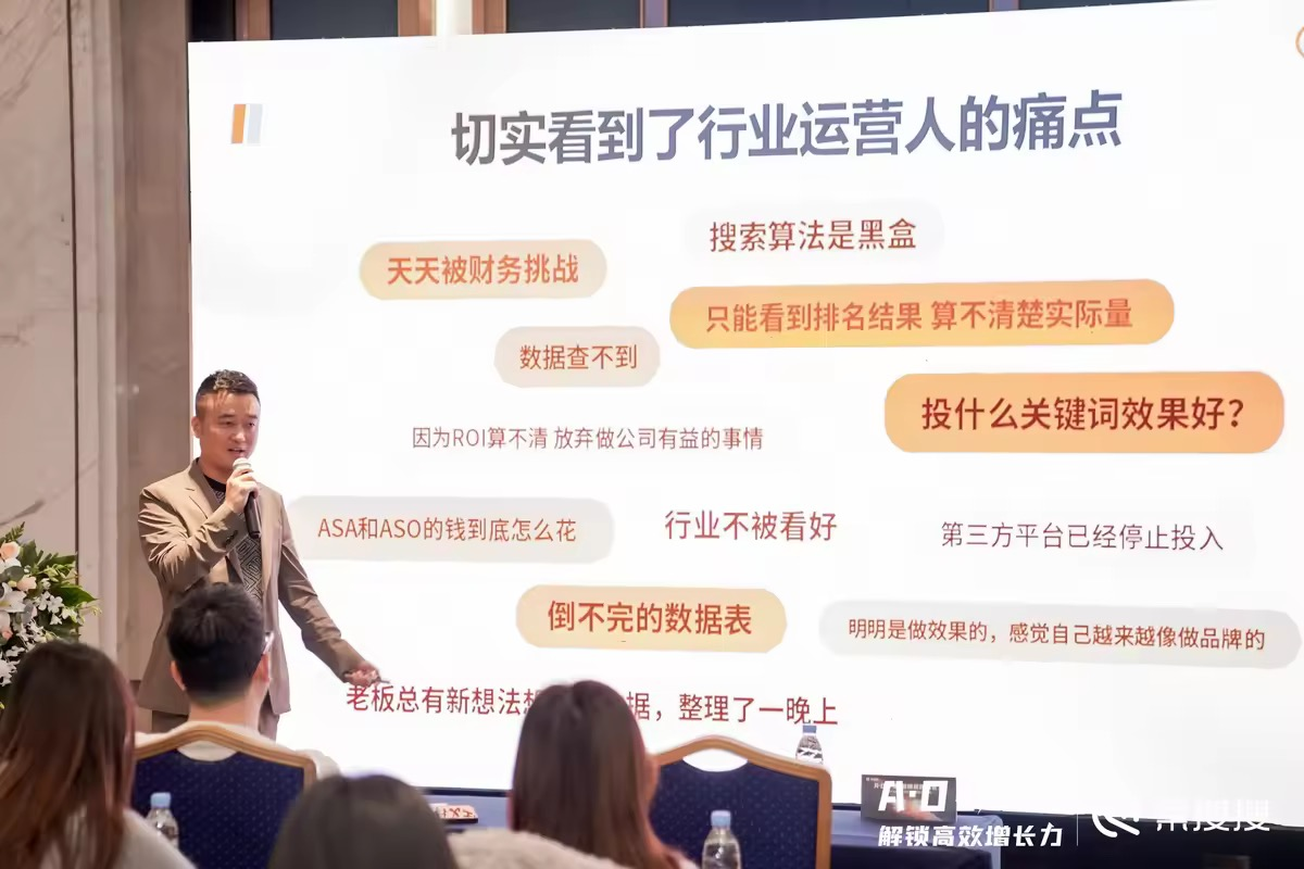 孙万龙进一步深入剖析了App Store投放决策平台的技术核心和功能特性,并解读了果搜搜“A·O全链路闭环的搜索营销解决方案”的理论逻辑。他详细介绍了产品如何利用专研算法模型并结合多维数据精准预估带量效果,以及超行业20%有效词库、大盘与竞品数据动态监控等功能,帮助App投放更科学地做决策。