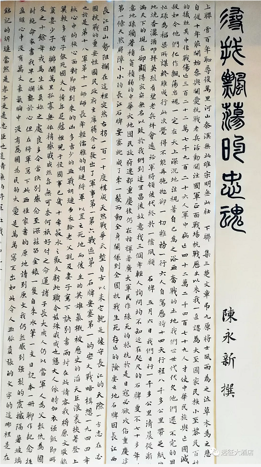 我的拙文《寻找飘荡的忠魂》,请本市青年书法家钱鸿波先生用小楷写就,悬于酒店三楼大堂。连同《长歌当哭祭忠魂——寻找飘荡的忠魂后记》一起,这样两篇风靡国内很多知名网站(今日头条、人民日报新媒体平台《人民号》、新浪、搜狐、腾讯、网易、凤凰、环球等200多家网站),连中国台湾、香港、澳门媒体,美国、澳大利亚等三十多个国家、六十多个华文网站也争相转载,阅读量达到天量(仅人民号一家阅读量就超66万)的文章,我觉得有足够的资格登堂入室,悬于自己酒店的大堂,也算敝帚自珍吧。由于篇幅所限,大堂仅挂正文,不挂后记。