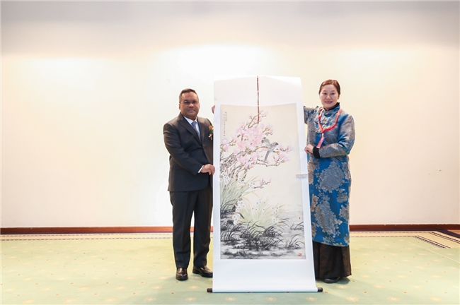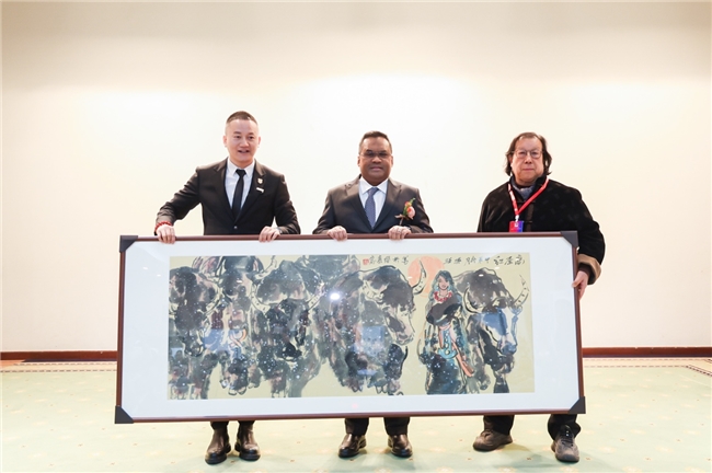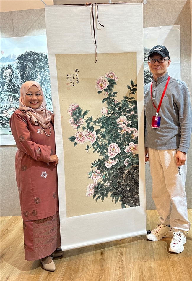 致辞环节过后,杨振廷先生、释行风先生与王俊英女士分别将精心创作的画作赠予马来西亚大使馆及大使。画作中巧妙融合了中马两国文化元素,大使欣然接受并高度赞扬了作品中蕴含的深厚情谊与艺术匠心,此环节将现场气氛推向了高潮。