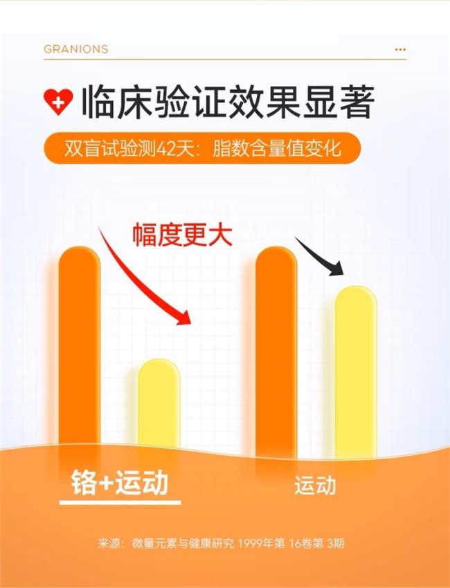 据了解,减脂人士经常遇到平台期难题,因为长期控制饮食、高强度运动,当人体会倾向于通过增加食物吸收率、降低基础代谢率等方式减缓减脂速度,据研究显示,运动搭配格兰宁控糖铬安瓶能够帮助减脂健身人士加速糖脂代谢、促进脂肪消耗和肌肉增加,加速度过平台期,有效攻克平台期难题。