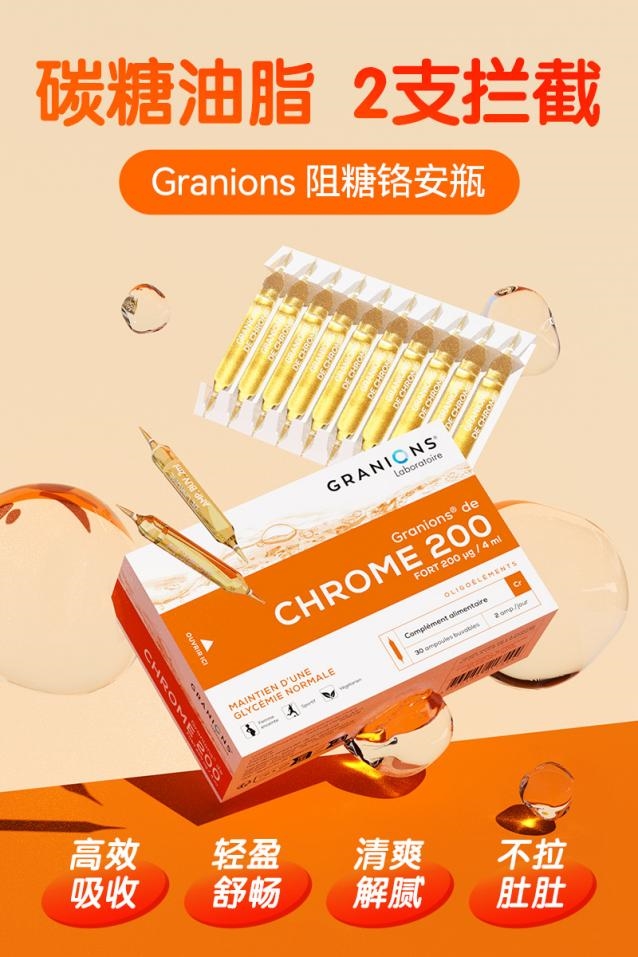 而Granions格兰宁控糖铬安瓶首创微量元素减重法,科学健康且不伤身,它是通过补充人体所需微量元素——三价铬元素,坚持每日补充200μg优质三价铬,从而改善糖脂代谢、抑制脂肪沉淀、促进脂肪消耗,真正做到从源头到去路管控热量,减少脂肪的形成,科学且不含任何药物激素,采用天然成分控体,相较于其他减脂内服,更天然、健康、有效!