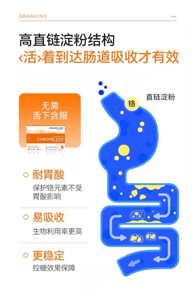 为了更好的促进身体对三价铬的吸收,Granions格兰宁控糖安瓶在配方上采用品牌76年独家专研的高直链淀粉包裹工艺,被包裹的铬离子很难被胃和小肠分解吸收,从而让铬元素更好的到达小肠,这样的配方结构耐胃酸、控糖效果更稳定,能更精准的达到减脂效果。