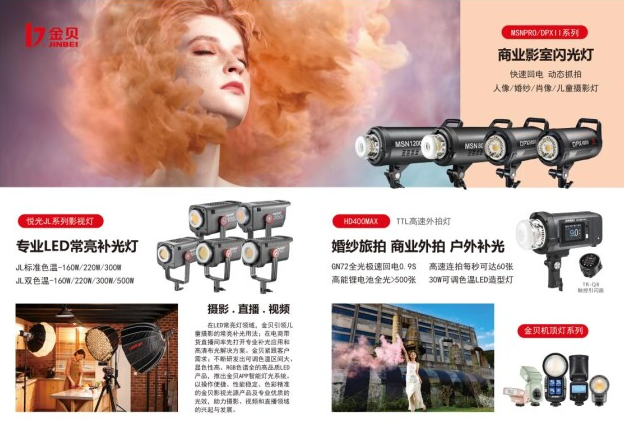 在LED常亮灯领域,金贝紧跟客户需求,不断研发出JL悦光系列可调色温区间大、显色性高、RGB色谱全的高品质LED影视常亮灯产品,不但引领儿童摄影的常亮补光用法,还在电商带货直播间率先打开专业补光应用和高清布光解决方案。例如:JL-160/160BI常亮补光灯、JL-220/220BI常亮补光灯、JL-300/300BI大功率影视灯、JL-300C全彩RGB影视灯、JL-500BI大功率双色温影视灯等热销型号。