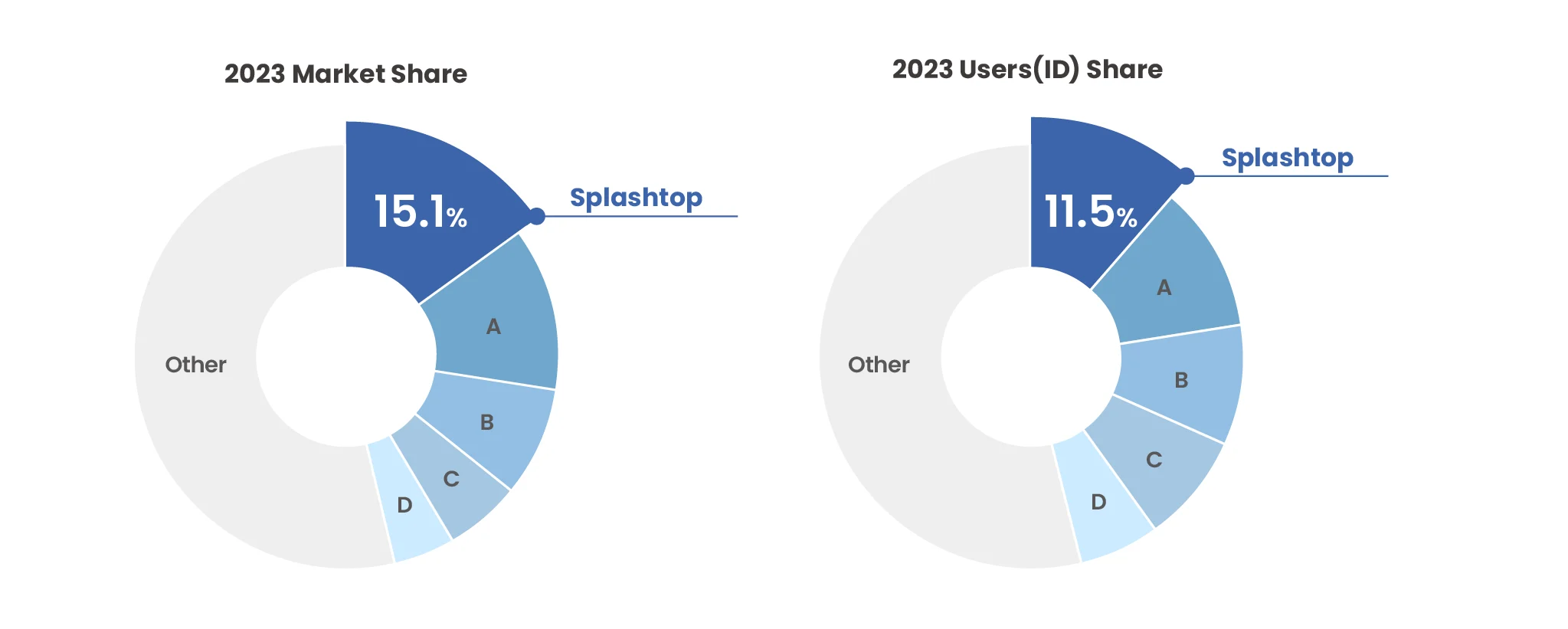 在该报告评估的远程访问服务中,Splashtop 在2023财年的营收排名第一(预计2024财年将继续保持),市场份额占比15.1%。Splashtop 的用户( ID )数量也排名第一,2023财年用户( ID )数量占比为11.5%。