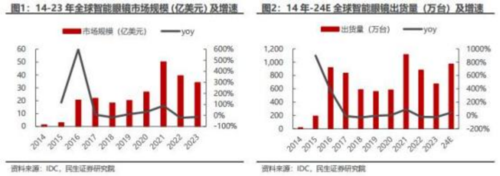 根据IDC数据 , 14-23 年全球智能眼镜市场规模从1.35 亿美元增至 34.16 亿美元,对应 CAGR为 49.71%,出货量从19.38 万台增长至 675.53 万台,对应 CAGR 为 55.87%;其中,2021年为行业规模峰值,全球智能眼镜市场规模达到 50.31 亿美元,出货量突破千万台;2022年后市场规模增长承压,近年来增速边际改善。