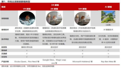 从广义角度看,智能眼镜包含 XR(VR、AR、MR)和 AI 眼镜等产品,其中 VR 眼镜通过计算机技术创建完全虚拟的数字世界,与物理现实世界隔绝;AR眼镜是将计算机实时生成的虚拟信息展现到真实环境中,保留了用户对现实世界的感知; MR眼镜在AR眼镜的基础上进一步提高对虚拟图像效果的真实性和虚实融合的要求,技术难度最高;而AI眼镜为传统眼镜向 AR/MR眼镜迭代的过渡形态,其备 AR/MR 眼镜拥有的扬声器、麦克风、独立电源等基本元件,但不配备显示屏幕。