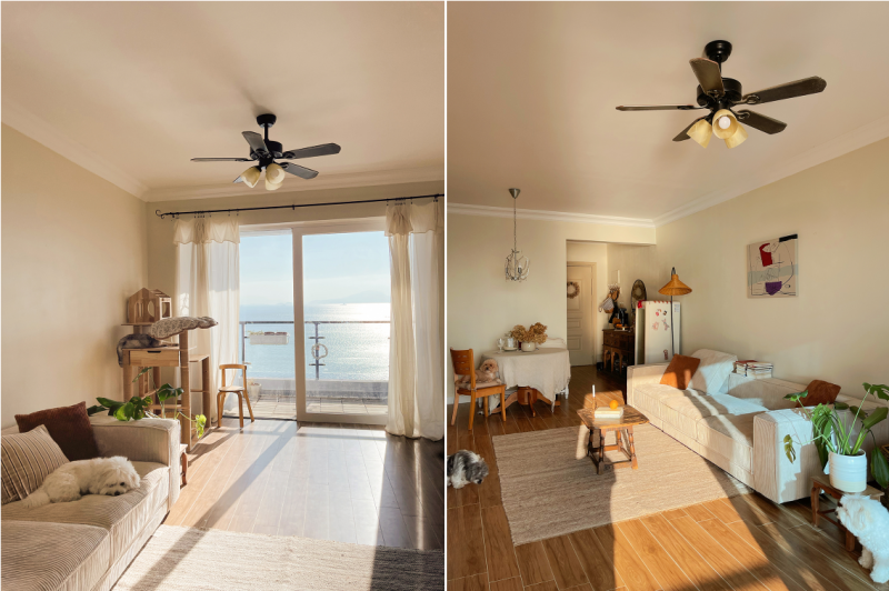 房子虽然是租的,但生活是自己的,小客厅换上全友豆腐块沙发,以简单利落的线条、温柔燕麦色配色,勾勒温馨一隅。黄昏时分,躺在沙发上静静地看海边日落,余晖漫入,满室金黄,暖意与治愈之感交织弥漫。