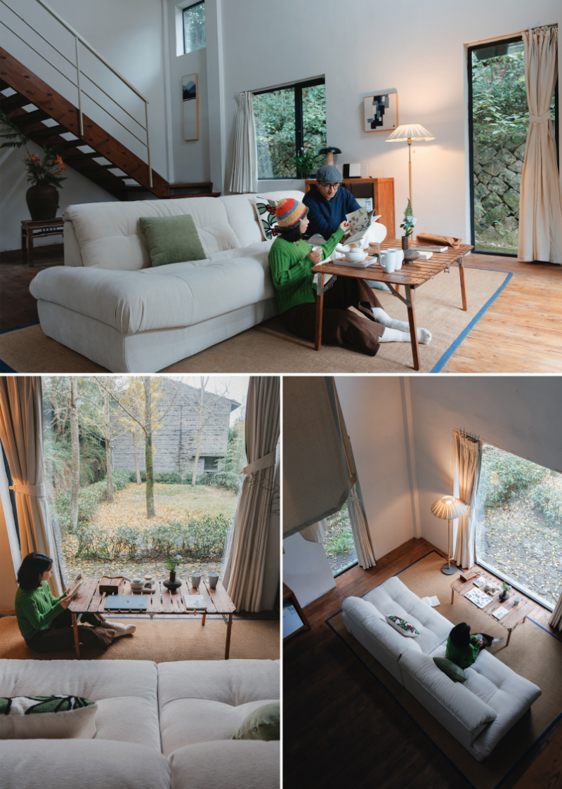 从都市白领转身为山中村民,他们的人生仿若按下重启键。在山林之中办公生活,通勤的烦恼消散于无形,生活的美好尽在眼前。超大落地窗前的全友沙发,成为了民宿里专属的舒适角落,躺在上面办公,闲暇时悠然休憩,消磨整日也不会觉得浪费。窗下有清风,耳畔有蝉鸣,目之是旷野,身后是山林,这便是@阿biu和二佳 在莫干山的旅居生活。