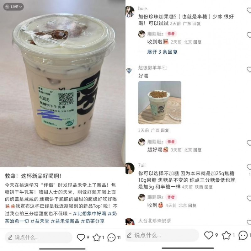 焦糖饼干牛乳茶的最大亮点在于其创新的小料——焦糖饼干碎。其标志性的酥脆口感、浓郁而不腻的焦糖味和巧妙融入的独特肉桂、姜等香料气息,共同在味蕾上演绎出一曲美妙的交响乐。而益禾堂巧妙地将焦糖饼干碎融入茶饮中,搭配着顶层的咸香奶盖,让人忍不住一口接一口,根本停不下来。