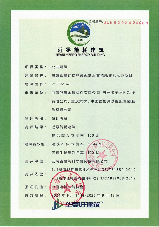 曲靖郎鹰金属构件有限公司联合重庆大学、苏州兹安材料科技有限公司、中国国检测试控股股份有限公司、华阳纳谷(北京)新材料科技有限公司、云南省建筑科学研究院有限公司、山海大象绿色建筑科技有限公司、曲靖麒麟职业教育集团,针对“云南省温和地区装配式钢结构近零能耗建筑技术”的研发目标,2024年8月顺利通过了云南省住房和城乡建设厅的结题验收。