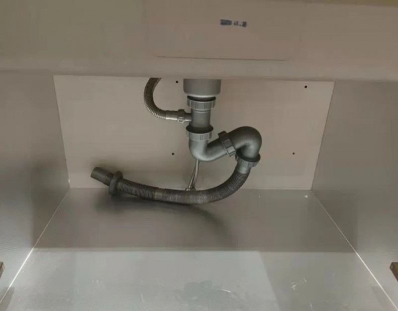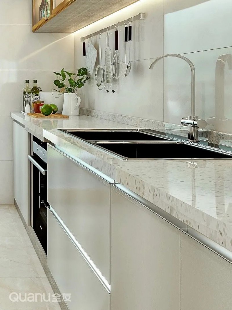 水槽位的柜内材料首选不锈钢板,防潮性强、耐用且更易于清洁维护;也可以选择锡箔纸,防潮性能良好,性价比更高。此外,在定制设计上,地柜要避免紧贴地面,建议在柜体下方砌一个10cm高的暗槽,不仅能有效防潮,还能增强柜体的稳定性。