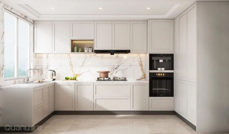 材料厨房潮湿,柜体易被油污侵染,因此在橱柜板材的选择上,建议采用防潮性更好、稳定性更强的实木多层板。门板根据不同的工艺,厚度可在18mm-22mm之间;底板、侧板、层板厚度建议在18mm左右,背板厚度≥9mm即可。