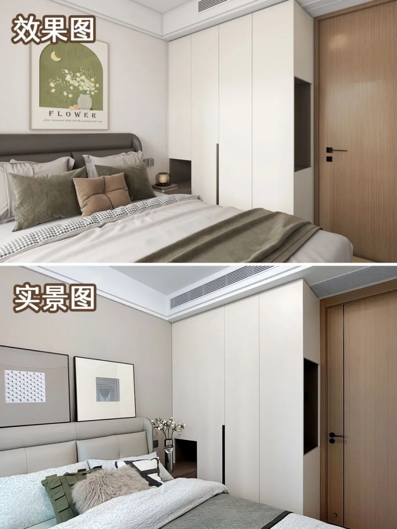 衣柜一门到顶,简约大气;内侧留空延展床头柜,外侧留空方便开关灯,实用又美观。