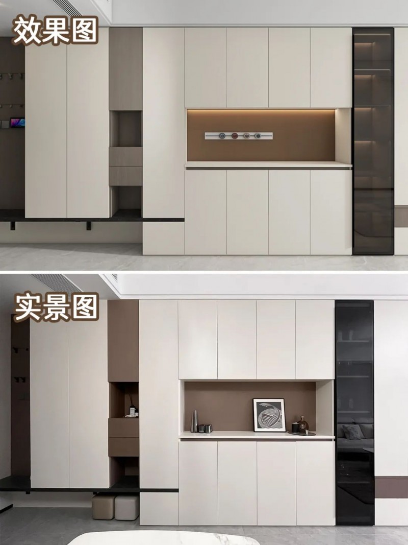 玄关柜+餐边柜一体,玄关柜悬空,通透有呼吸感,餐边柜中部留空,可置放常用小家电。
