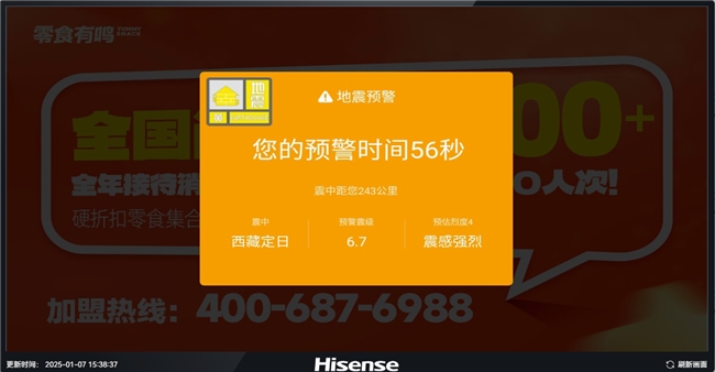 (本图片来自零食有鸣公司位于日喀则市的门店系统后台截图。1月7日灾情发生当日的下午,“零食有鸣公司”在日喀则市的20多家门店均接收到了类似地震预警)