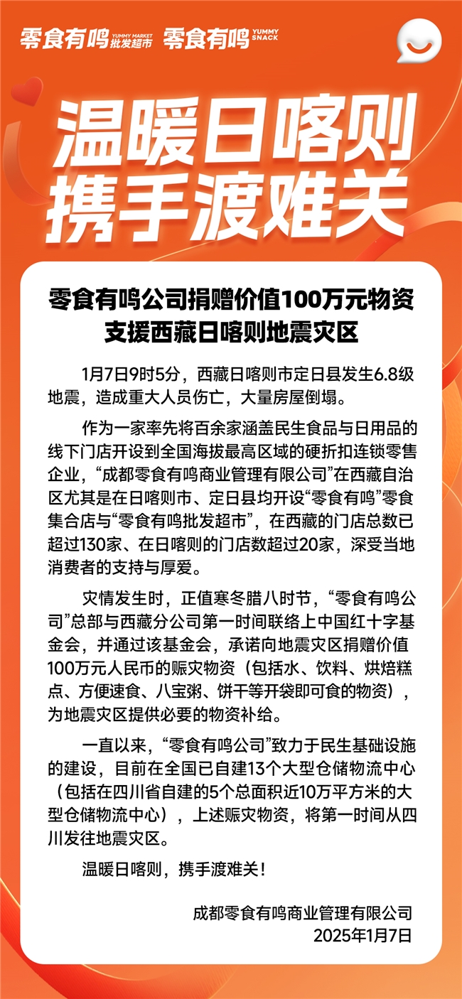 定日县的地震灾情发生的当天,“零食有鸣公司”总部与西藏分公司就第一时间联络上了中国红十字基金会,承诺通过该基金会,向地震灾区捐赠价值100万元人民币的赈灾物资(包括水、牛奶、烘焙糕点、方便面、八宝粥、饼干等开袋即可食的物资),为地震灾区提供急需的物资补给。