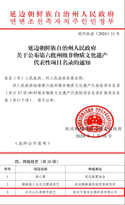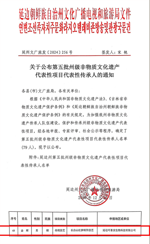 此次申遗的另一亮点,是非遗项目传承人的认定工作。继“长白山红参制作技艺”申遗成功之后,根据延边州文旅局《关于开展第五批州级非物质文化遗产代表性项目代表性传承人申报工作的通知》,长森源开展了“长白山红参制作技艺”非遗项目代表性传承人的申报和推荐工作。
