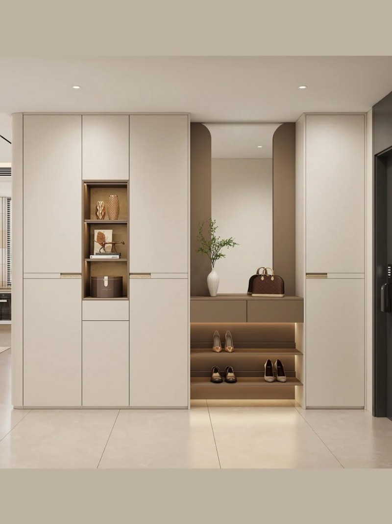 进门定制玄关柜,撞色开放格增添层次感,蜀锦澜花背板艺术柔美浪漫,收纳展示两不误~叠级设计错落有致,穿衣镜方便整理仪容,每天出门都是满分状态。