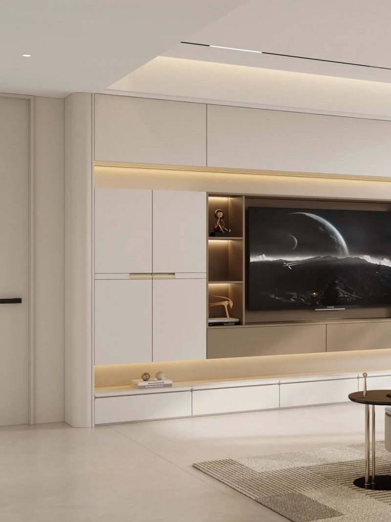 悬浮电视柜灵动轻盈,奶油感门板时尚耐看,灯带+玻璃柜设计更添通透之感,花瓣皮革拉手温柔精致,柜体线条简雅有质感,圆弧转角自然柔和,安全更贴心。