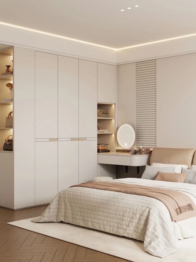 衣柜梳妆台一体设计,梳妆置物都方便,省下床头柜空间。侧边收纳柜设计精巧,包包等随身物品随手可取,日常生活更便捷。