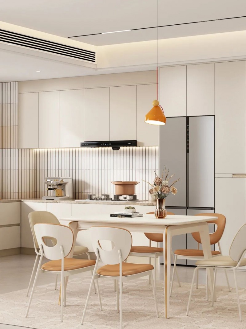 整墙餐边柜,中部留空打造操作台,搭配可移动滑轨插座,实用便捷。冰箱零嵌节约空间,整体性强、圆弧转角防磕碰,用餐时光更加安心惬意~