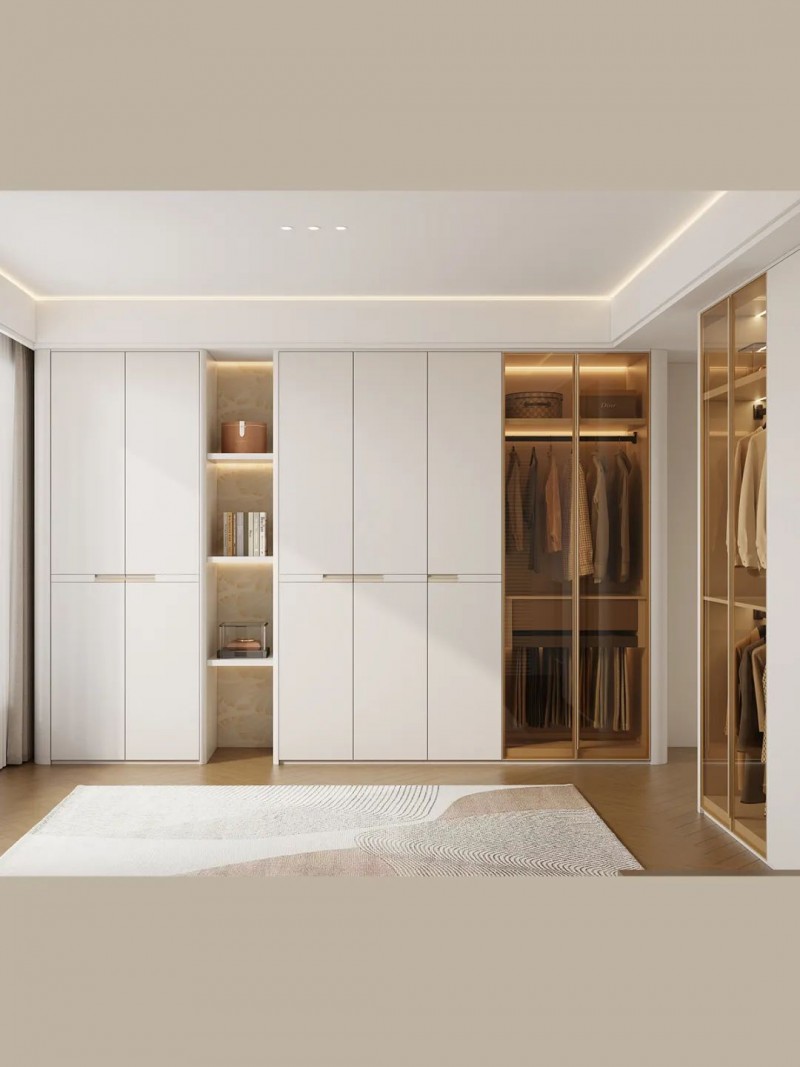 床侧衣柜巧作隔断,集化妆间、首饰台、衣帽间于一体。床尾定制整墙衣柜,奶油白柜门搭配茶色玻璃门,空间温柔雅致。
