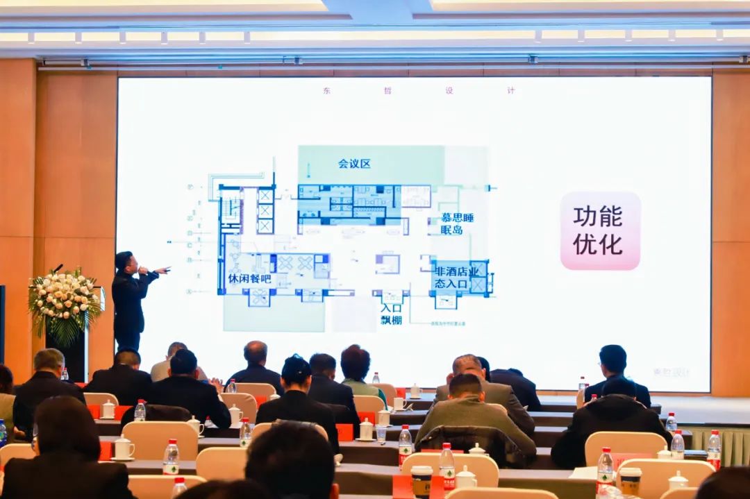 东哲设计创始人李造做了《存量酒店更新改造与设计》的主题演讲。他指出,中国酒店业与房地产共同进入了存量时代,营业年限长的酒店将面临更新改造的挑战,由于缺少其他多样化配套空间,客房缺乏舒适度,酒店缺乏复购率。很多酒店重硬装,轻软装,高估了投资回报。目前很多老酒店存在着设施设备老化,审美落伍、缺乏故事, 东哲设计会通过轻硬装、重策划、重软装、完善配套、优化房型来强化消费者体验。他对多个酒店设计案例进行了详细的讲解。