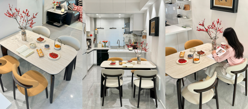 小飞象餐桌,桌面采用洞石岩板,还原自然风貌,纹理细腻有质感。洞石岩板有颜有质,硬度高抗划伤,抗污抗渗耐高温,经久耐用,清洁轻松。时尚大象腿,扁头圆角创意设计,弧度流畅优雅,多面切割打破常规,黛黑木纹更添格调。悬浮台面让人眼前一亮,曲线空盈更显通透。加厚岩板与板材双层台面,多重防护,稳固承托幸福每一餐。
