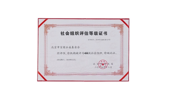 此次评估由北京市民政局委托专业评估机构,对所有参评的市级社会组织按照内部治理、党的建设、发挥作用情况、遵章守规情况、诚信建设这五个一级指标进行评估。最终,宝健公益基金会被评定为4A级社会组织。