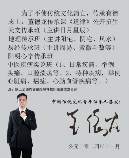 在传承文化的方式上,董德龙开设了多个公开招生且不收费的道律课程班次,包括天文传承班(主讲日月星辰)、地理传承班(主讲风水地理)、周易传承班(主讲周易)、阳明心学班、紫微斗数班、论命班等等。其招生方式更是独树一帜,将道德作为首要考量因素,而非看重钱财多少。