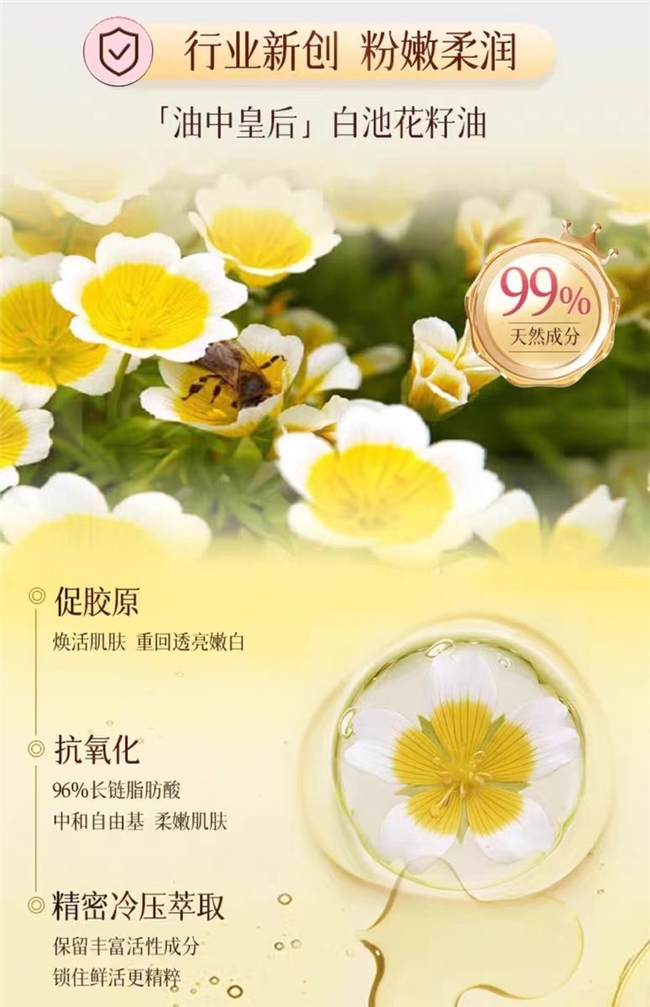 洁妮贝女性护理油还复配了向日葵籽油、椰子油和红没药醇等多重天然成分,与私处黏膜的天然油脂层高度契合,采用纯油配方,不添加一滴水和乳化剂,最大程度地保留了油的纯度,特调弱酸配方,不破坏原生pH,通过四维渗透技术,让每一滴精华能够深入皮肤,实现温和清洁、滋润保湿、舒缓疗愈和长效修复的多重功效。