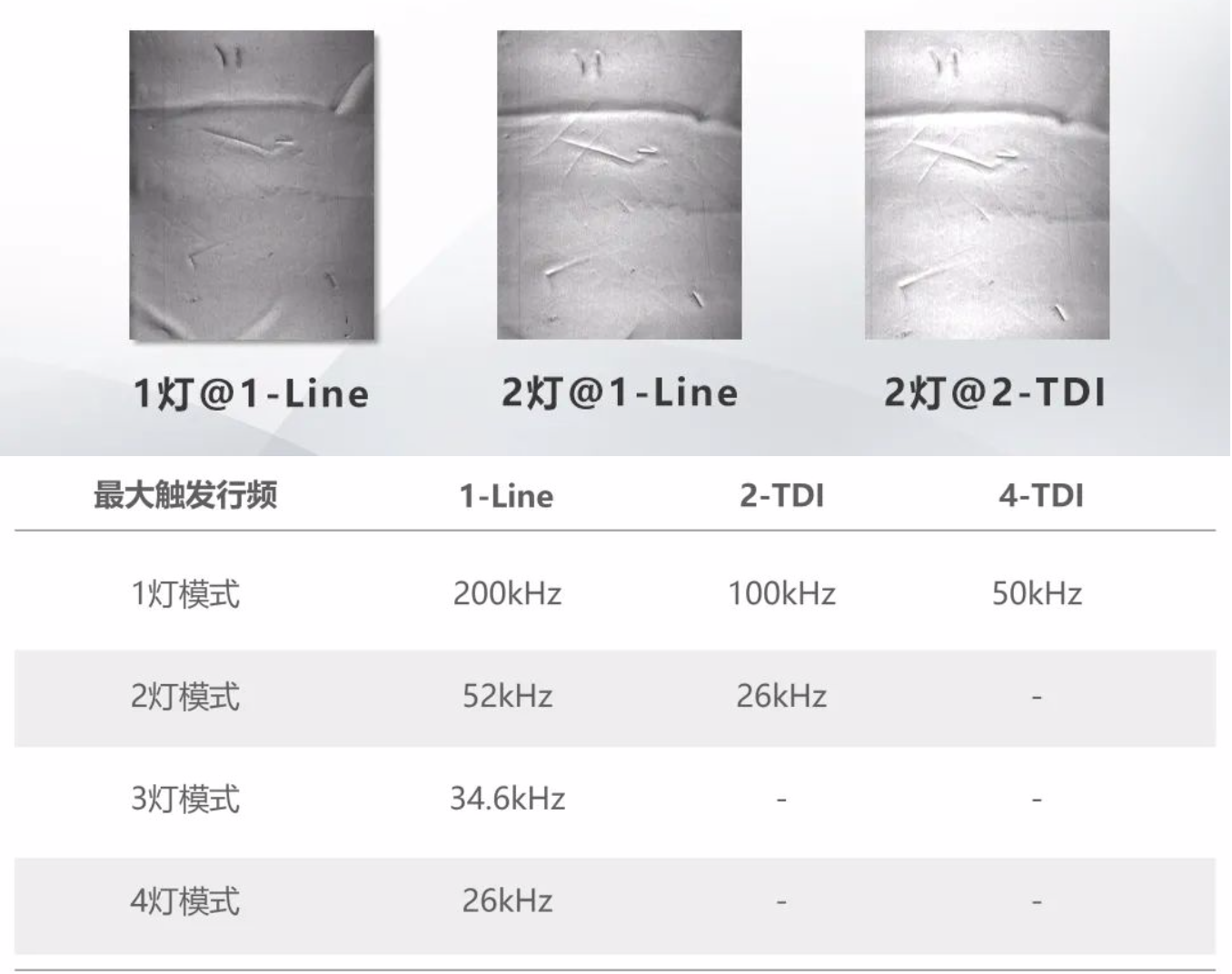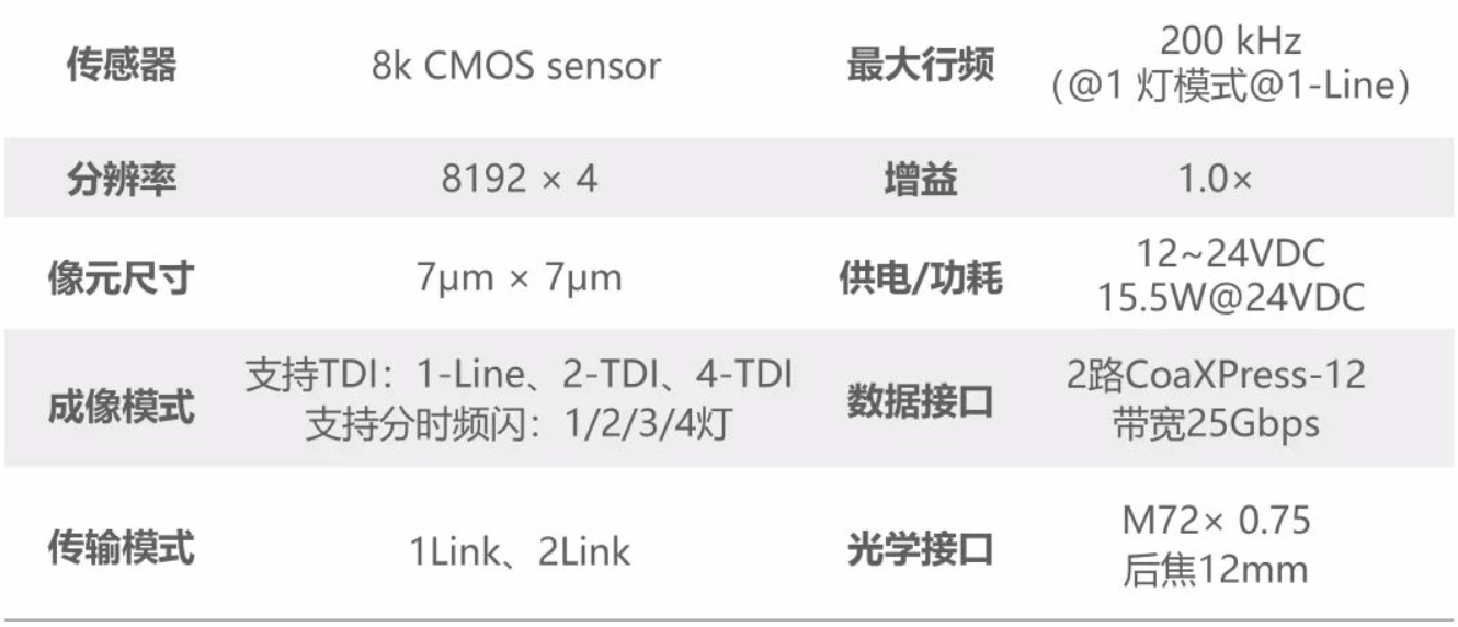 相机采用4线COMS Sensor,可支持至多4灯分时或4-TDI成像,也可实现2灯分时叠加2-TDI成像,采集方式灵活多样,能够根据不同的照明条件和目标特性,提供最佳的成像效果,适配多种应用需求。