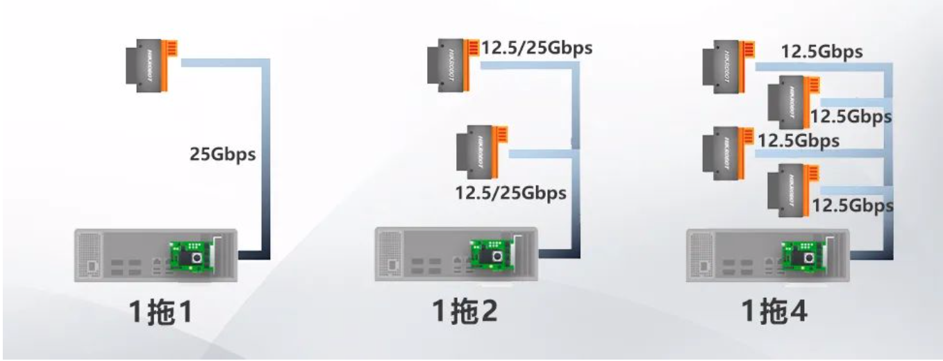 海康机器人具备不同CXP接口数量的配套采集卡,可支持1拖1、1拖2、1拖4等多种连接方式。客户可根据对行频及整套方案的架设需求灵活选择拓扑连接模式,性价比高。