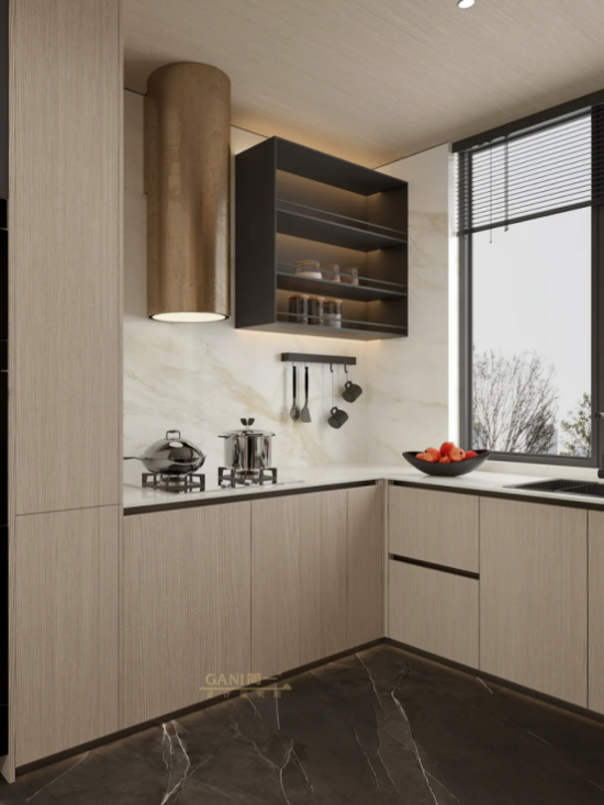 厨房采用经典的U字型布局,合理的空间分配使得烹饪动线更加清晰高效,让下厨者能够轻松自如地完成每一道工序。地面沿用了全屋大面积铺贴的卡拉卡塔黑,而与之相对的墙面,则选用了浅色的卡拉卡塔,温润的自然肌理与深邃的黑色基调形成鲜明的色彩对比,两者相互交织,营造温润高级的空间美学感。