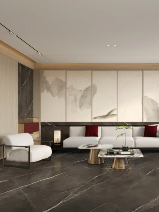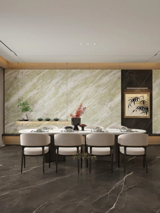 在色彩搭配上,客厅巧妙地采用了米色、淡灰色等温和的中性色调,这些色彩相互交织,营造出一种平和、舒缓的视觉感受。而质感强烈的深色超密缝岩板卡拉卡塔黑的运用,则成为了整个空间的点睛之笔。温润的质感纹理深邃而不失温馨,与周围的中性色调相互映衬,让空间更显稳重大气。