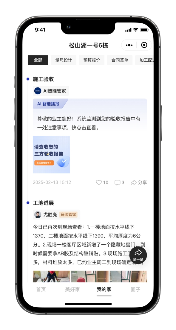 装修过程中的监工工作也不再让人烦恼。简一美好家AI智能管家会深入分析业主的房屋信息,实时收集和分析工地数据,为业主提供全程跟踪服务和提醒。它还能深入分析业主提供的户型信息,推荐多款设计案例供业主选择,助力打造理想家园。同时,通过智能监测与分析,AI能够预测潜在问题,比如提前报告同小区楼栋基层安全的潜在隐患,让业主及时采取措施,确保居住环境的舒适与安全;还能对业主同小区楼栋验收中出现的问题或风险进行智能预警,并给出解决方案建议。不仅如此,在简一美好家小程序上,用户可以随时随地查看施工各环节的实时动态,轻松掌握施工进度与质量,让装修过程变得透明、高效、简单。