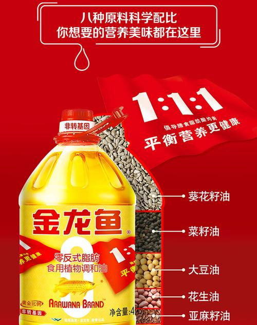 在选购食用油时,除了看NRV%,我们还要关注油的种类和加工方式。金龙鱼食用油有多种类型,如葵花籽油、玉米油、花生油等,每种油的脂肪酸组成和营养特点各不相同。消费者应根据自己的健康需求和饮食习惯来选择合适的食用油。
