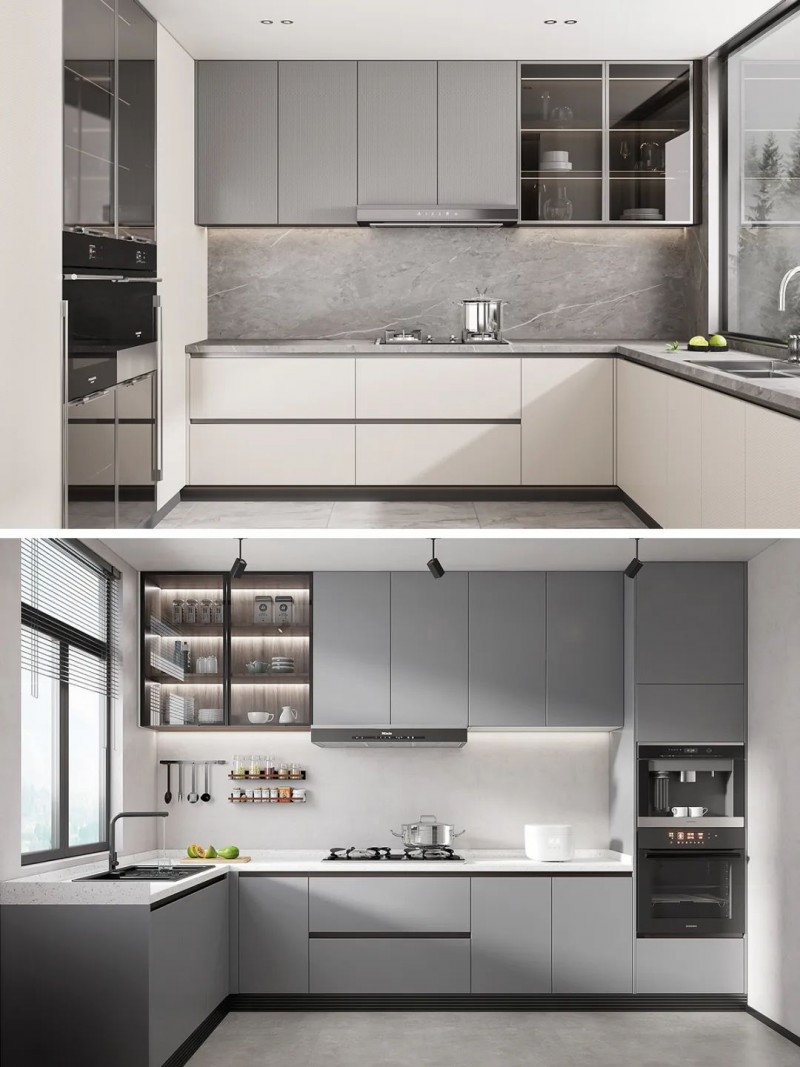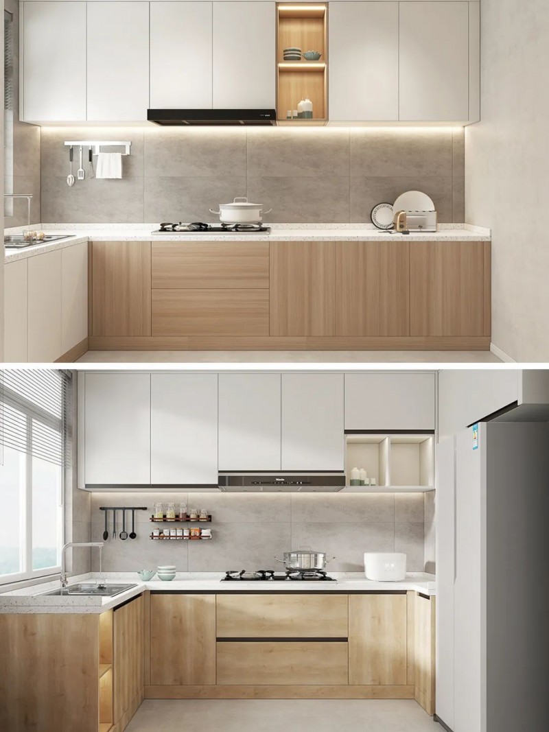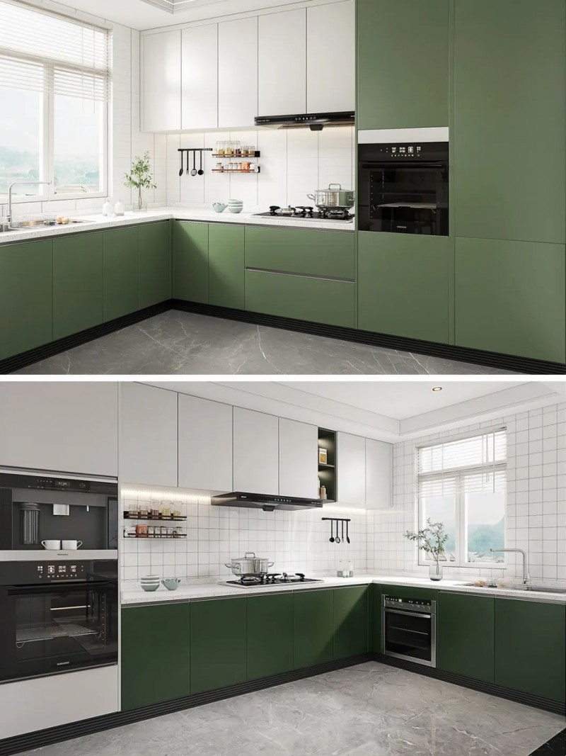 比较小众的一款配色,白色吊柜+绿色地柜,深浅搭配层次感强,地柜也不易脏。