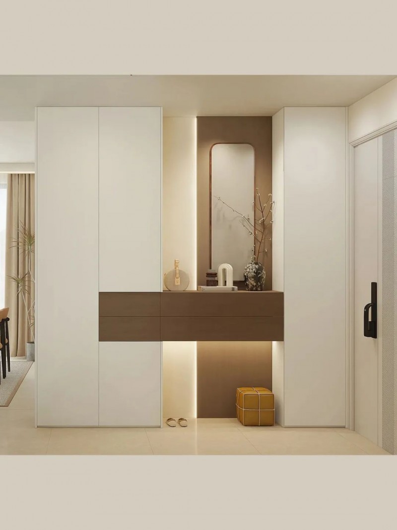 玄关柜采用意式奶冻色与胡桃楸搭配,增强立体感,进门便奠定了中古感基调。留空处点缀艺术摆件,更添雅致,同时安装穿衣镜,方便出行整理仪容。