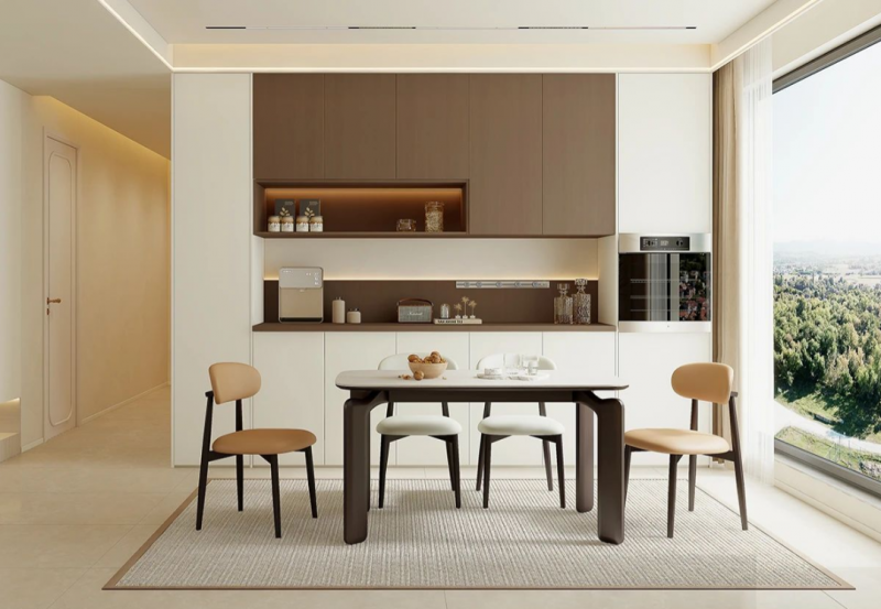 定制中古风餐边柜,复古配色搭配简洁线条,营造满满氛围感。中部留空搭配可移动滑轨,方便小家电灵活使用。柜体内嵌蒸烤箱,让美味出锅即食。