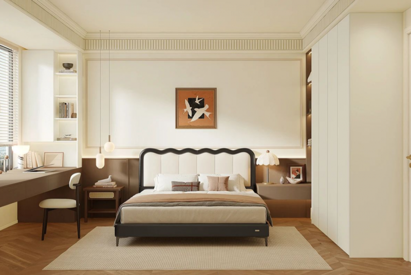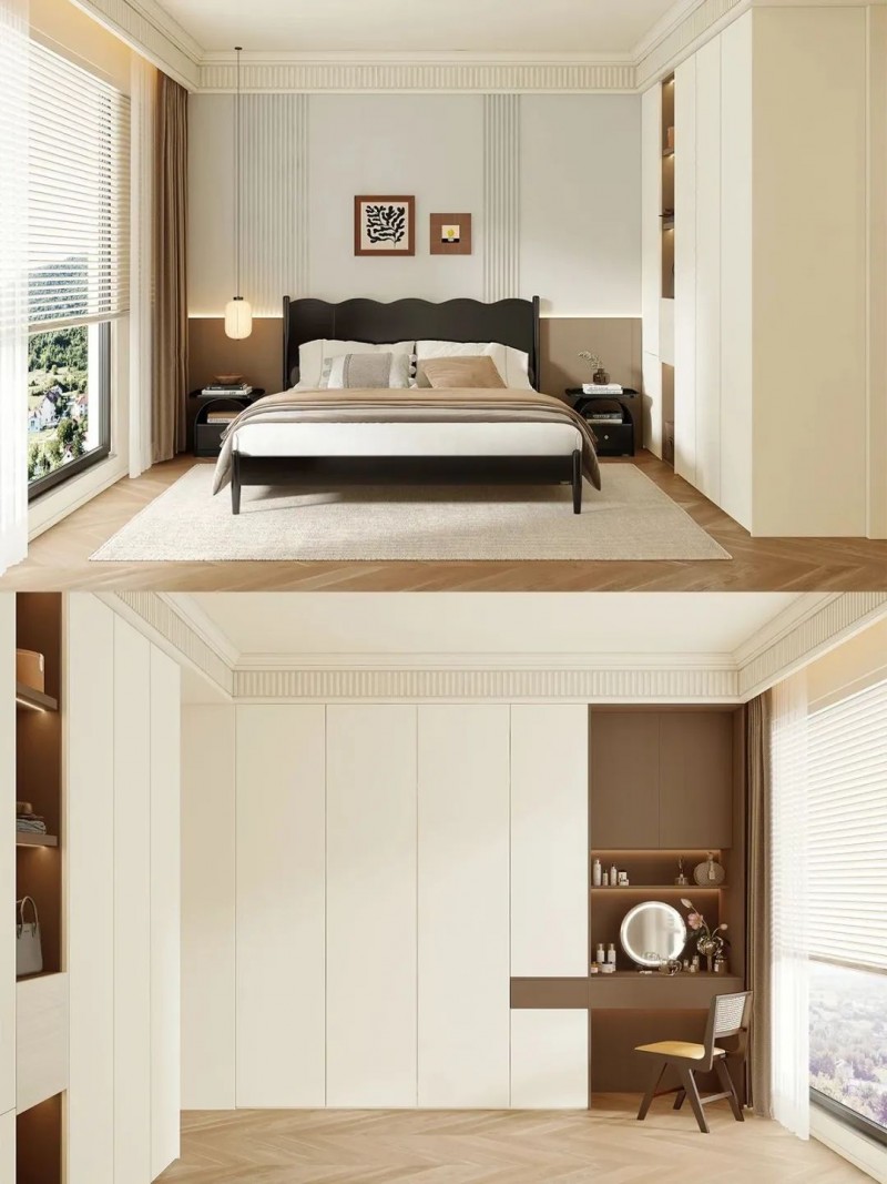 奶油风配色营造温馨氛围,骨骼线护墙板增添复古雅致。衣柜延展台面充当床头柜,整体性强。靠窗定制悬空台面,光线优越,办公梳妆一桌搞定,侧边柜还能收纳书籍、护肤品。